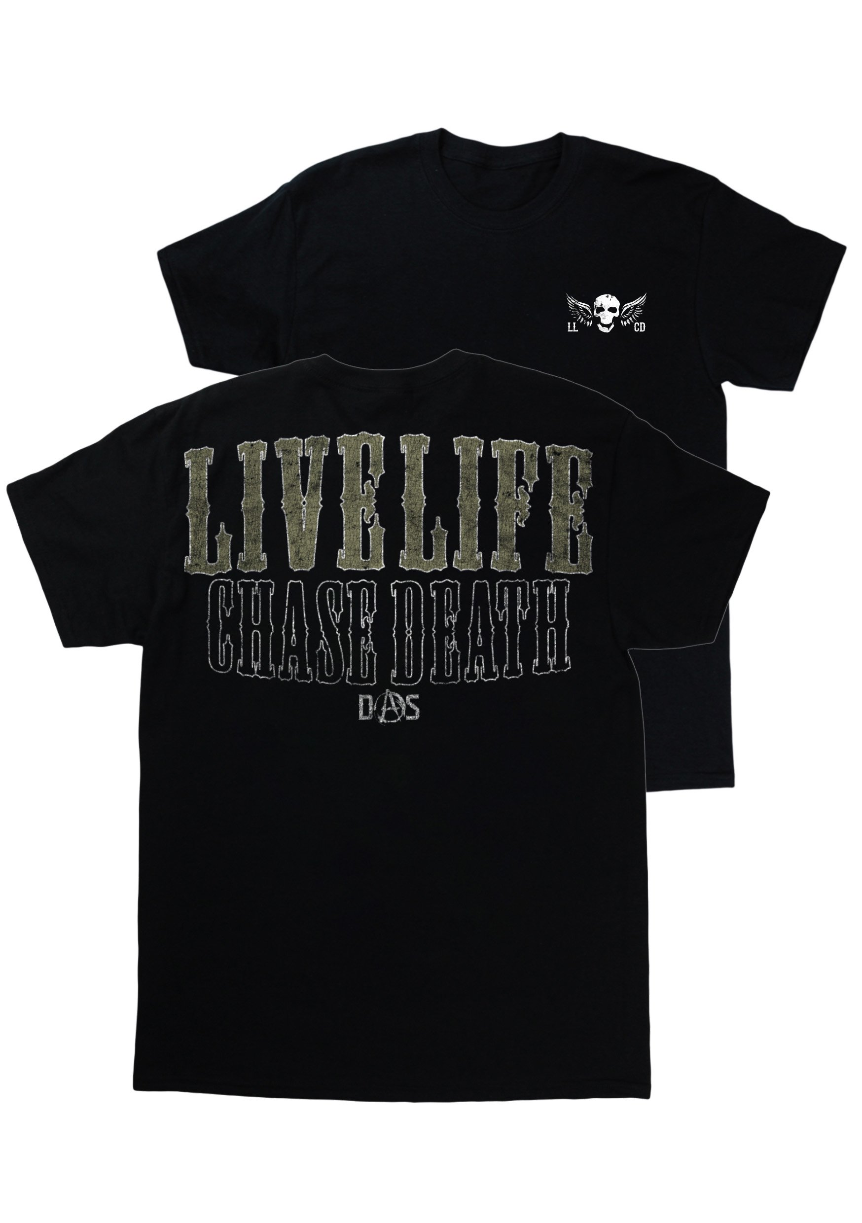 LLCD. Big print on back. Small print on left chest.