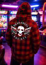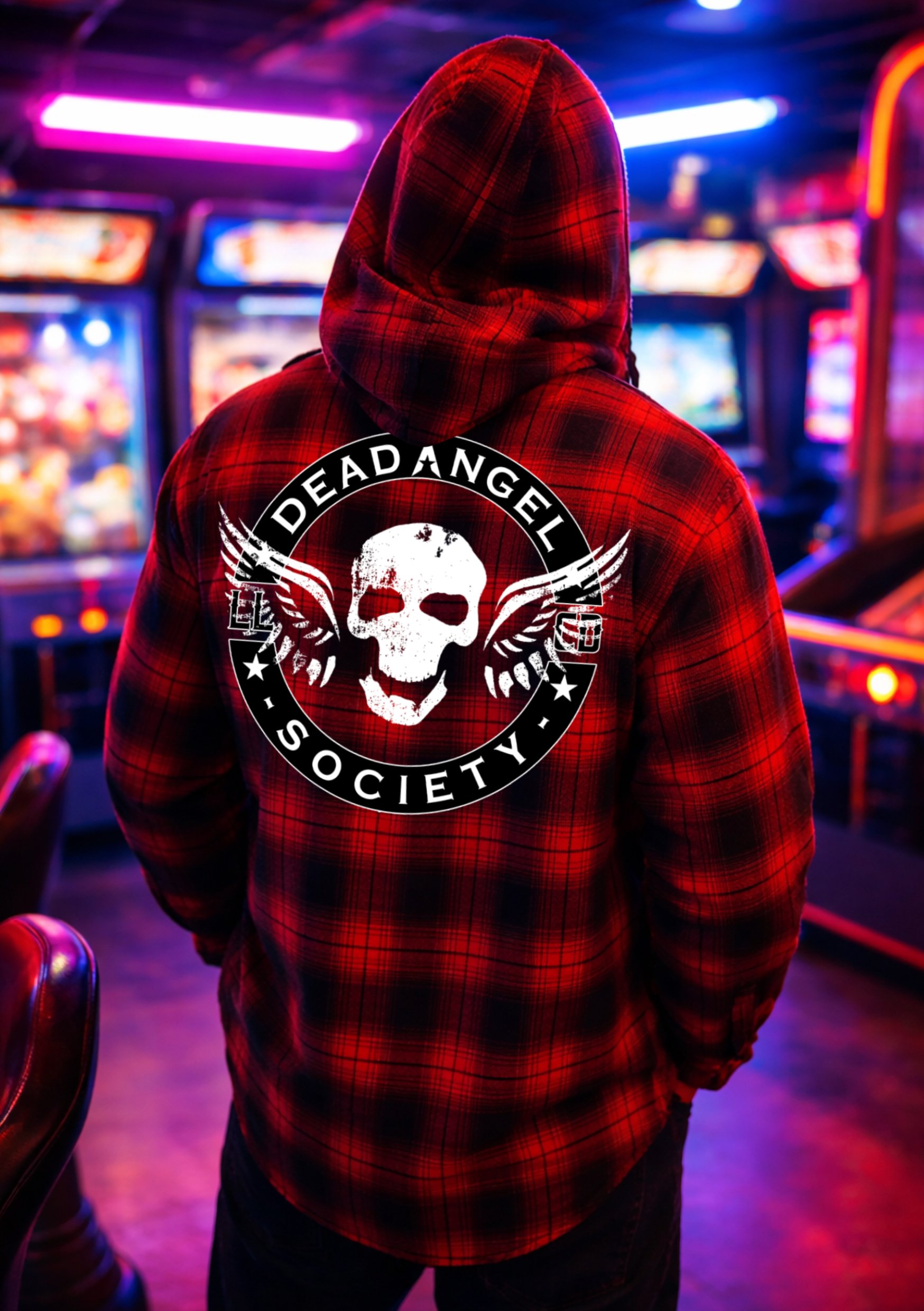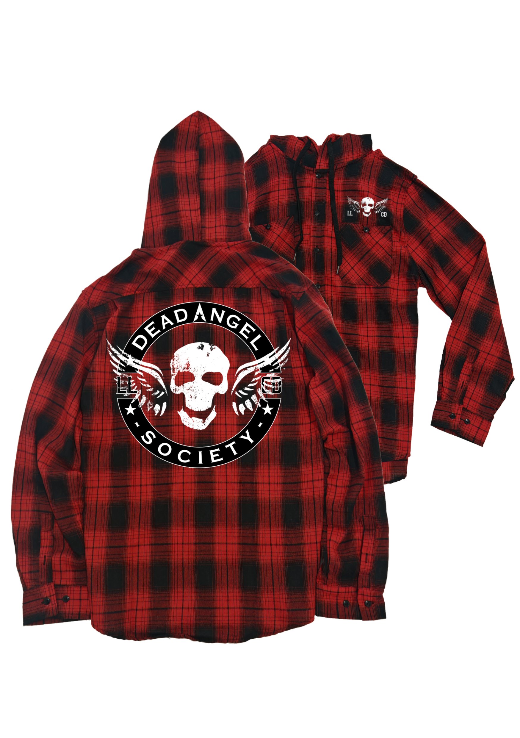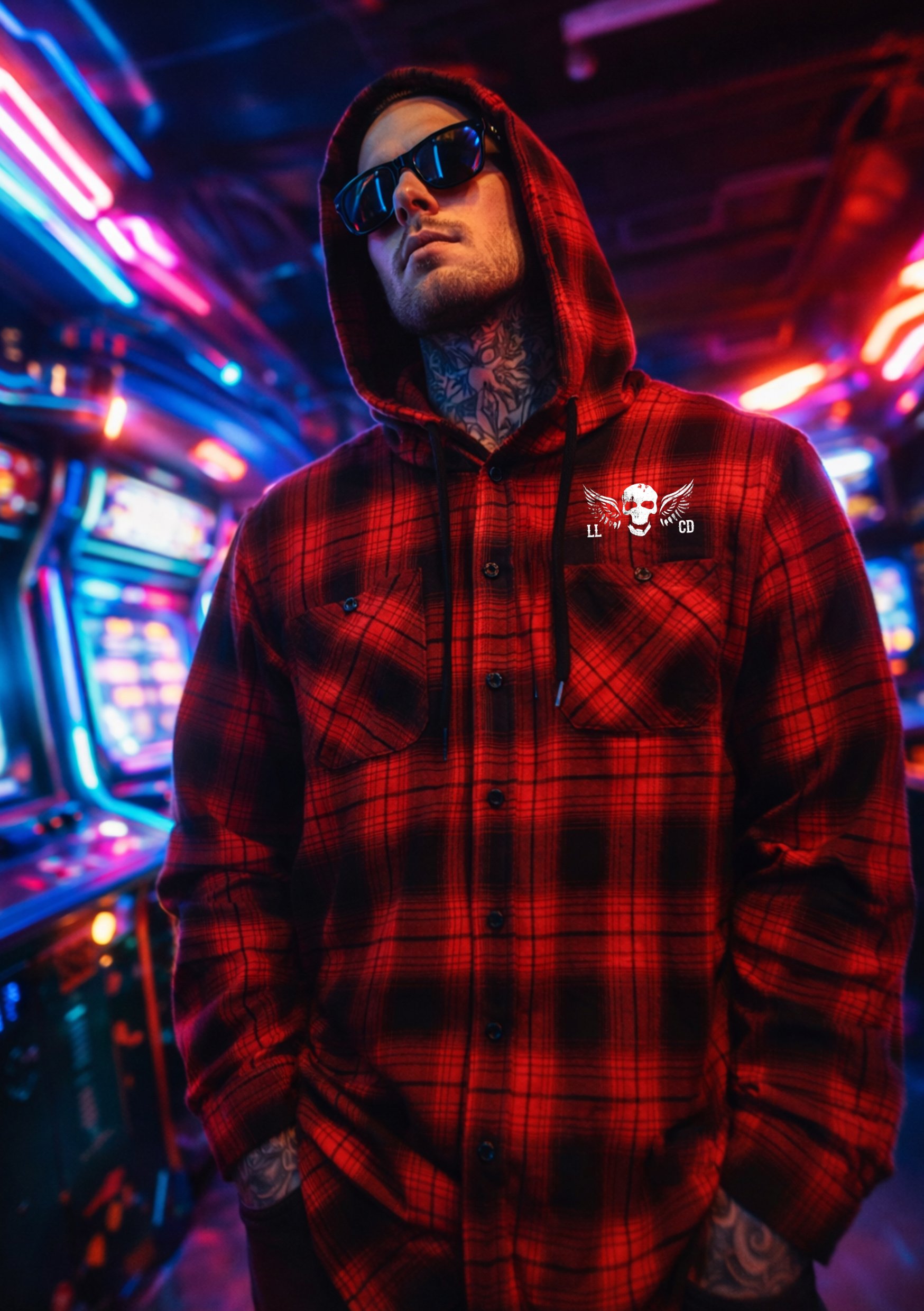 Black/Red Flannel Hooded Shirt. Big Print on back. Small logo on front left chest.