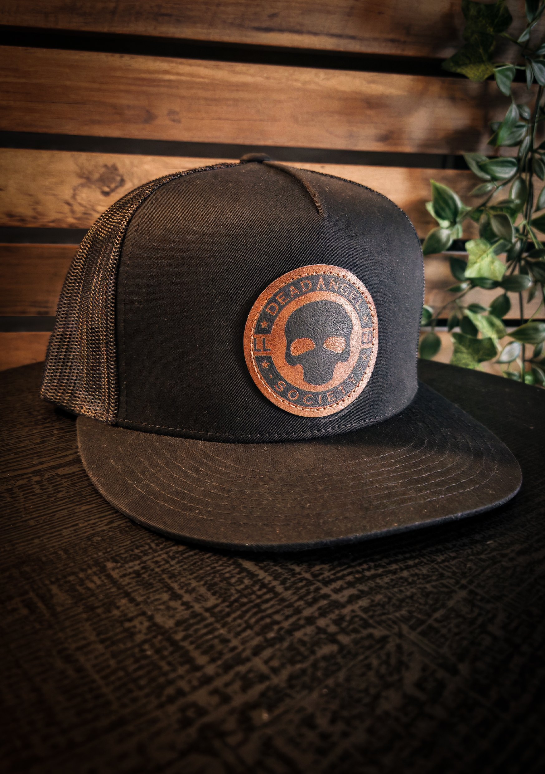 Leather patch with black Emblem on front.