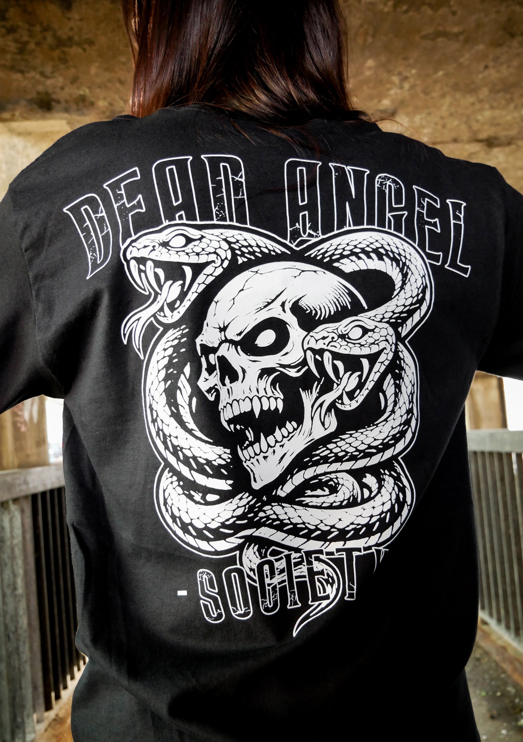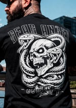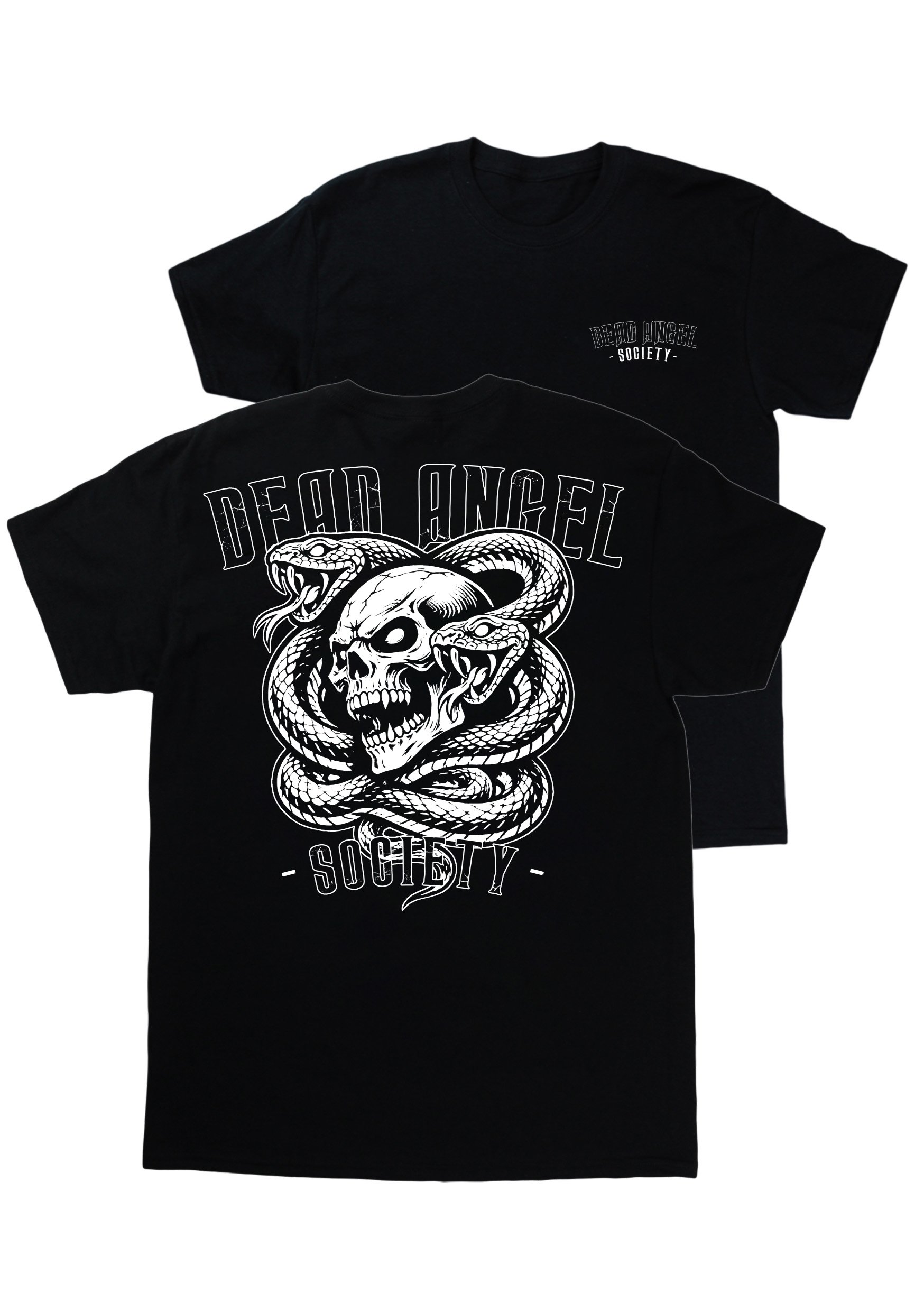 Snakes. Big print on back. Small print on left chest.