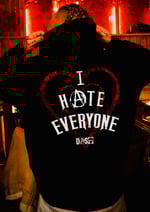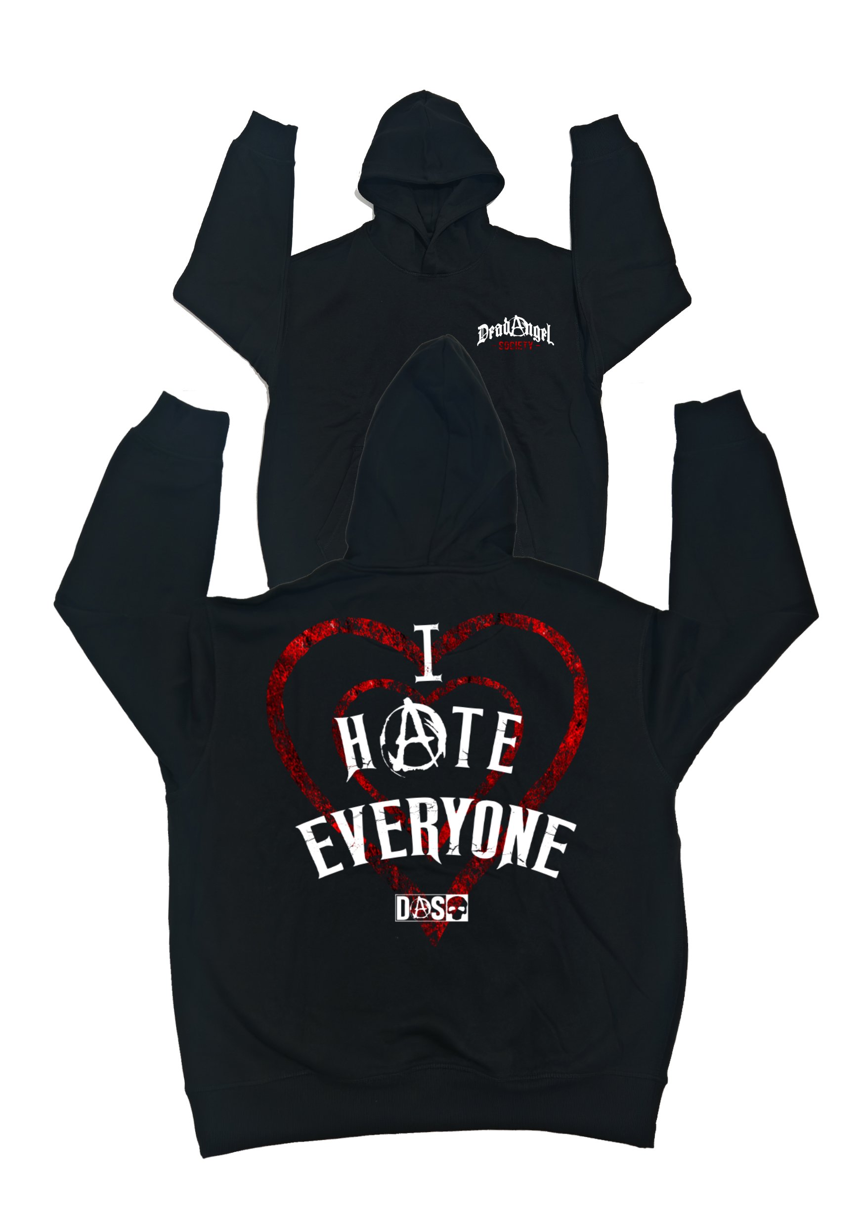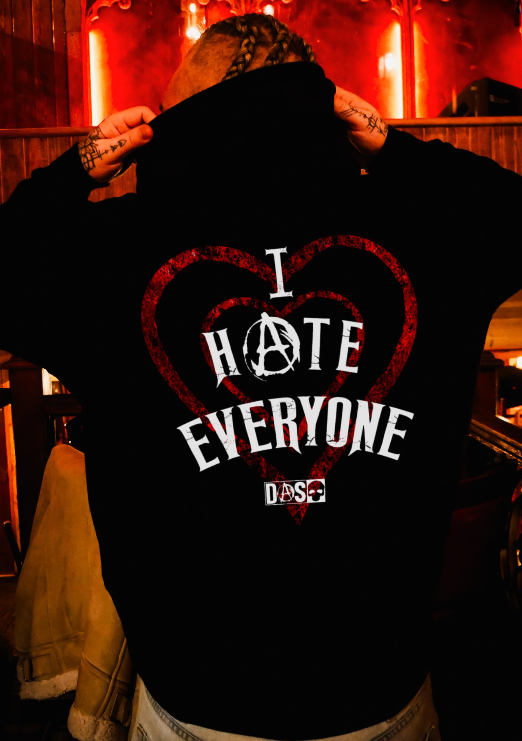 I HATE EVERYONE v2. Big print on back. Classic logo on front left chest.
